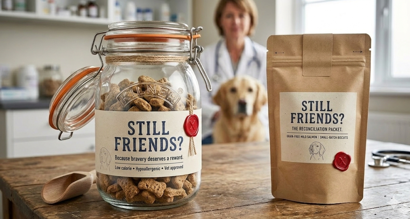 “Let's be honest, the car ride to the clinic is usually one long guilt trip. Our new vet was lovely and spoiled him with loads of treats. He seemed to really like them, so I picked up a bag at reception to make amends."